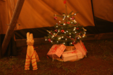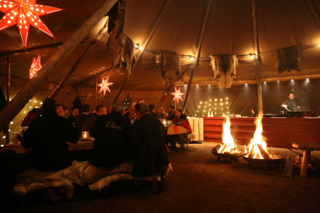 Die Hat Giant Kåta (sprich: Kota), ein Riesen-Tipi, wurde direkt am Polarkreis, in der Heimat des Weihnachtsmannes, gefertigt. Passend zum Fest schmücken wir das Zelt stimmungsvoll mit Lichterketten, Tannengrün und Rentierfellen. Ein Lagerfeuer, unterstützt durch isolierte Außenwände, sorgt für eine angenehme und warme Atmosphäre. Im Zelt servieren wir aus großen Pfannen ein frisch zubereitetes Buffet. Anschließend lassen Sie den Abend gemütlich am Lagerfeuer ausklingen. Vorab können Sie unsere Winterspiele buchen, die für viel Spaß und gute Laune sorgen.