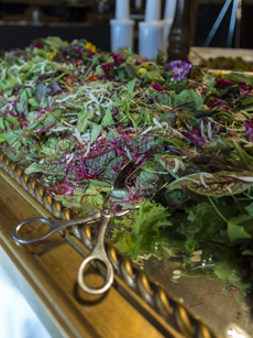 - Blattsalatvariationen dekoriert mit Sprossen, gerösteten Kernen und gehobeltem Parmesan-Käse, dazu reichen wir individuelle Dressings