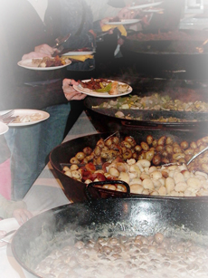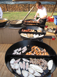 Unser kompetentes Küchenteam bereitet diese Menüs direkt vor Ihren Gästen in Riesenpfannen zu.